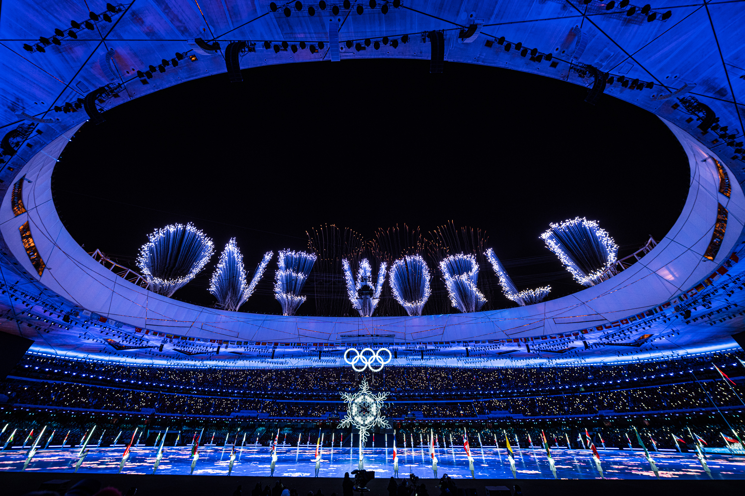 Noslēguma ceremonija sākās ar mākslinieciskiem priekšnesumiem, bet pēc tam stadionā iesoļoja valstu karognesēji, Latvijas karogu nesot bobsleja stūmējam Matīsam Miknim. Pēc karognesējiem stadionā ienāca arī pārējie sportisti, kuri vēl nav atstājuši Pekinu.