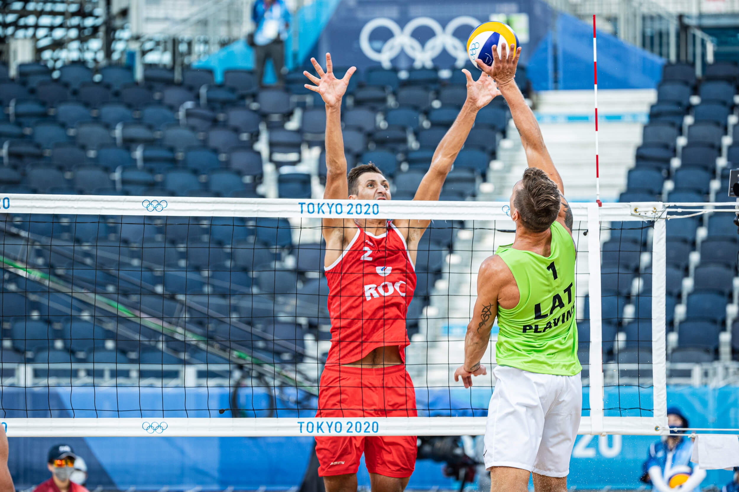 Savā pirmajā cīņā Tokijas smiltīs Pļaviņš/Točs, kuri turnīrā izsēti ar 14.numuru, ar rezultātu 2-1 (13:21, 21:19, 15:11) pārspēja Krievijas Olimpiskās komitejas duetu Vjačeslavu Krasiļņikovu un Oļegu Stojanovski, kuriem Olimpiādē ir otrais numurs.